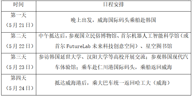 项目由辅导员带队,返程后由学生工作处开具实践证明,凭实践证明可加创新创业学分或社会实践分1分(由学生所在学院认定),可作为思政实践课实践环节提交报告。实践费用2200元/人,费用含国际段船票燃油港口税,船餐,韩国境外段费用及司机导游小费,签证费,领队费用,境外百万旅意险,往返大巴校园至港口接送,参加项目的威海校区学生每人补助1000元,学生实际缴费1200元。具体行程如下:
